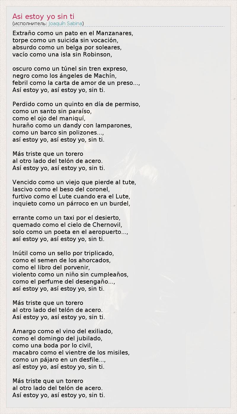 Это интересно:Хоаки́н Рамо́н Марти́нес Саби́на (исп. Joaquín Ramón Martínez Sabina, род. 12 февраля 1949, Убеда, Испания) — испанский рок-поэт, певец, композитор; один из столпов современной испаноязычной поп и рок-культуры. Автор-исполнитель, поставивший своё имя в один ряд с именами Боба Дилана, Жака Бреля, Сержа Генсбура или Бориса Гребенщикова, сходным образом оказавших влияние на культуру стран родного языка.Родился... продолжение