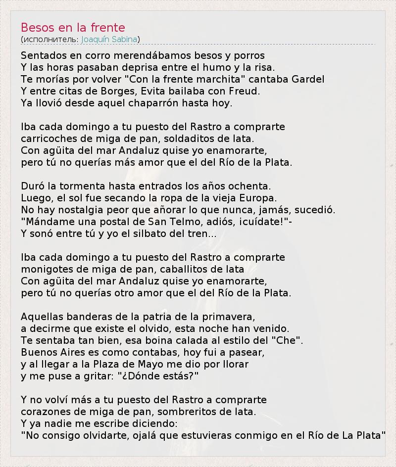 Sentados ан Корро merendábamos Besos у porros Y -лас Horas Pasaban deprisa Entre -эль Хумо у ла Риса . Те Morias POR Volver & Quot ; Con ла Фронт marchita & Quot ; cantaba Гардель Y Entre CITAS де Борхес , Эвита bailaba кон Фрейда . Я. llovió Desde AQUEL chaparrón Hasta Hoy . Iba Када Доминготу Puesto дель Растроcomprarte carricoches де МИГА де пан , soldaditos де лата . Con agüita Дель-Мар Andaluz quise лет enamorarte , Перо tú нет querías más амор Que эль -дель-Рио -де- ла-Плата . Duro ла TORMENTA хаста entrados лос años ochenta . Luego , El Sol ФРУ secando ла Ропа -де-ла -Вьеха Europa . Нет сено ностальгия Peor Que añorar вот дие Nunca , JAMAS , sucedió . & Quot ; Mándame уна почтовый де-Сан- Тельмо , Adiós , ¡ cuídate & Quot ; ! - Y Sono Entre tú у йо -эль silbato дель трен ... Iba Када Доминготу Puesto дель Растроcomprarte monigotes де МИГА де пан , caballitos де лата Con agüita Дель-Мар Andaluz quise лет enamorarte , Перо tú нет querías другое одно амор Que эль -дель-Рио -де- ла-Плата . Aquellas Бандерас де ла Патрия -де-ла Primavera , decirme Que existe эль Olvido , ЭСТА Noche хан venido . Те sentaba загар Bien , эша Boina calada аль Estilo дель & Quot ; Че & Quot ;. Буэнос-Айрес -эс- Комо contabas , хой Fui в pasear , у аль llegarла Плаза де Майо меня Dio POR Llorar у меня PUSE в gritar : ? & нетканого материала ¿ Donde Estas & Quot ; Y не volví не másту Puesto дель Растроcomprarte Corazones де МИГА де пан , sombreritos де лата . Y я Nadie меня escribe diciendo : & Quot ; Нет consigo olvidarte , Оджала Que estuvieras Conmigo ан -эль- Рио-де- Ла-Плата и Quot ;