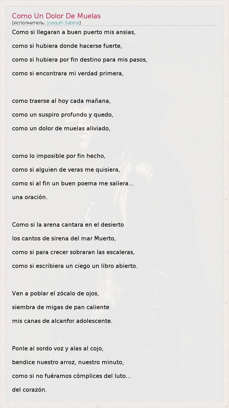 Это интересно:Хоаки́н Рамо́н Марти́нес Саби́на (исп. Joaquín Ramón Martínez Sabina, род. 12 февраля 1949, Убеда, Испания) — испанский рок-поэт, певец, композитор; один из столпов современной испаноязычной поп и рок-культуры. Автор-исполнитель, поставивший своё имя в один ряд с именами Боба Дилана, Жака Бреля, Сержа Генсбура или Бориса Гребенщикова, сходным образом оказавших влияние на культуру стран родного языка.Родился... продолжение