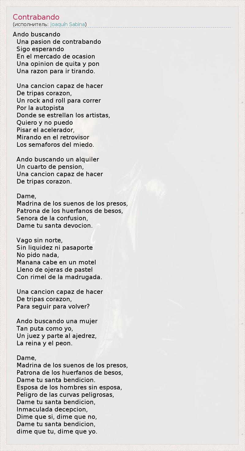 Это интересно:Хоаки́н Рамо́н Марти́нес Саби́на (исп. Joaquín Ramón Martínez Sabina, род. 12 февраля 1949, Убеда, Испания) — испанский рок-поэт, певец, композитор; один из столпов современной испаноязычной поп и рок-культуры. Автор-исполнитель, поставивший своё имя в один ряд с именами Боба Дилана, Жака Бреля, Сержа Генсбура или Бориса Гребенщикова, сходным образом оказавших влияние на культуру стран родного языка.Родился... продолжение