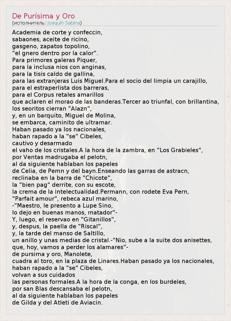 Это интересно:Хоаки́н Рамо́н Марти́нес Саби́на (исп. Joaquín Ramón Martínez Sabina, род. 12 февраля 1949, Убеда, Испания) — испанский рок-поэт, певец, композитор; один из столпов современной испаноязычной поп и рок-культуры. Автор-исполнитель, поставивший своё имя в один ряд с именами Боба Дилана, Жака Бреля, Сержа Генсбура или Бориса Гребенщикова, сходным образом оказавших влияние на культуру стран родного языка.Родился... продолжение