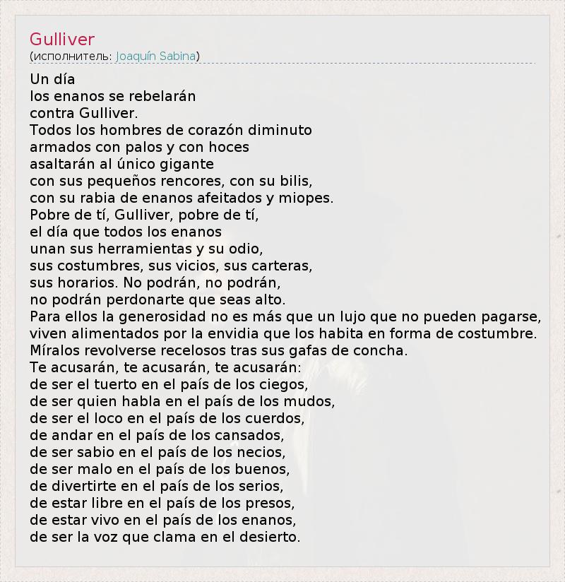 Это интересно:Хоаки́н Рамо́н Марти́нес Саби́на (исп. Joaquín Ramón Martínez Sabina, род. 12 февраля 1949, Убеда, Испания) — испанский рок-поэт, певец, композитор; один из столпов современной испаноязычной поп и рок-культуры. Автор-исполнитель, поставивший своё имя в один ряд с именами Боба Дилана, Жака Бреля, Сержа Генсбура или Бориса Гребенщикова, сходным образом оказавших влияние на культуру стран родного языка.Родился... продолжение