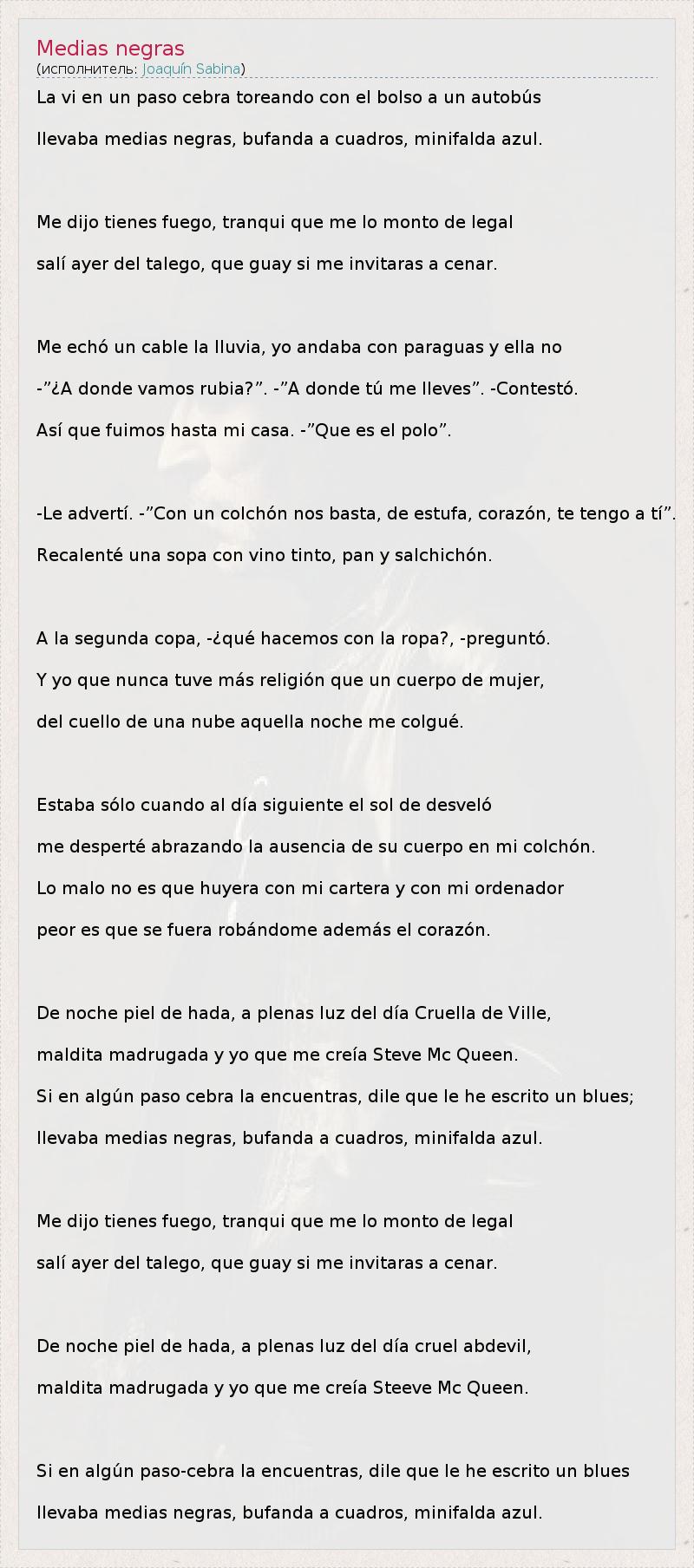 Это интересно:Хоаки́н Рамо́н Марти́нес Саби́на (исп. Joaquín Ramón Martínez Sabina, род. 12 февраля 1949, Убеда, Испания) — испанский рок-поэт, певец, композитор; один из столпов современной испаноязычной поп и рок-культуры. Автор-исполнитель, поставивший своё имя в один ряд с именами Боба Дилана, Жака Бреля, Сержа Генсбура или Бориса Гребенщикова, сходным образом оказавших влияние на культуру стран родного языка.Родился... продолжение