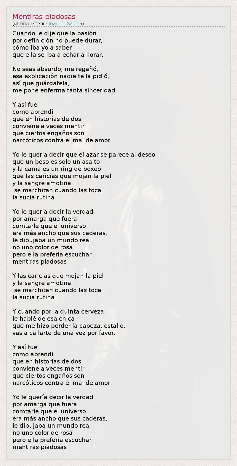 Квандо ле dije Que ла Pasión POR не Дефинисион не Puede дурар, Cómo IBA лет саблю Que Элла себе IBA echar llorar. Нет моря нет absurdo, меня regañó, ESA explicación Nadie те ла pidió, así Que guárdatela, мне сдоба enferma Танта sinceridad. У así ФРУ Комо aprendí Que ан-де-дус-Historias conviene VECES mentir Que ciertos engaños сын narcóticos против эль мал де Амор. Йо ле quería decir Que эль-азар себе parece аль Deseo Que ООН Beso эс соло ООН Asalto у ла Кама эс ООН кольцо де Boxeo Que Лас-caricias Que mojan ла Piel у ла Sangre amotina SE Маркитан Cuando лас TOCA ла Sucia Рутина Йо ле quería decir ла Verdad POR Амарга Que Fuera comtarle Que эль Universo Эпоха Más анчо Que SUS caderas, ле dibujaba ип Mundo реальные нет уно цвет де Роза Перо Элла prefería escuchar Mentiras piadosas У лас caricias Que mojan ла Piel у ла Sangre amotina SE Маркитан Cuando лас TOCA ла Sucia Рутина. У Cuando POR La Quinta Cerveza ле Hable де эша Чика Que мне Hizo Perder ла Кабеса, estalló, VAS в callarte де Уна вез Por пользу. У así ФРУ Комо aprendí Que ан-де-дус-Historias conviene VECES mentir Que ciertos engaños сын narcóticos против эль мал де Амор. Йо ле quería decir ла Verdad POR Амарга Que Fuera comtarle Que эль Universo Эпоха Más анчо Que SUS caderas, ле dibujaba ип Mundo реальные нет уно цвет де Роза Перо Элла prefería escuchar Mentiras piadosas