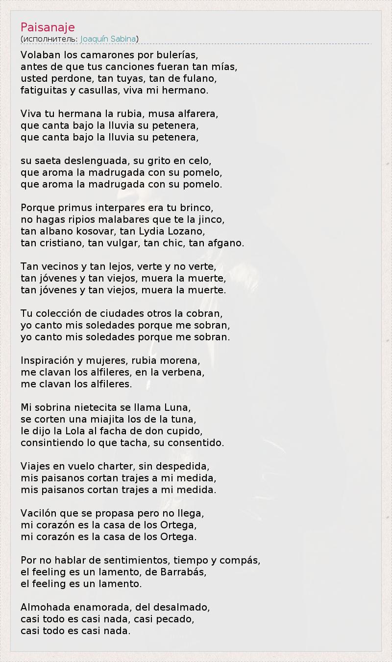 Это интересно:Хоаки́н Рамо́н Марти́нес Саби́на (исп. Joaquín Ramón Martínez Sabina, род. 12 февраля 1949, Убеда, Испания) — испанский рок-поэт, певец, композитор; один из столпов современной испаноязычной поп и рок-культуры. Автор-исполнитель, поставивший своё имя в один ряд с именами Боба Дилана, Жака Бреля, Сержа Генсбура или Бориса Гребенщикова, сходным образом оказавших влияние на культуру стран родного языка.Родился... продолжение