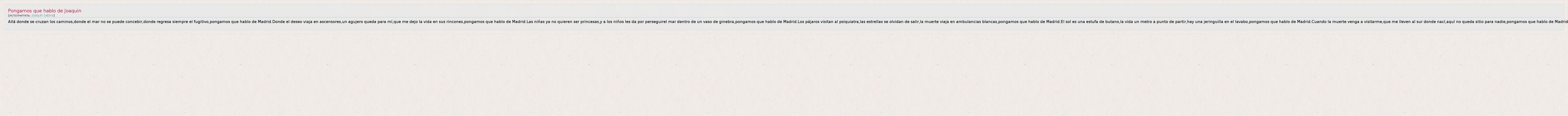Allá donde se cruzan los caminos,donde el mar no se puede concebir,donde regresa siempre el fugitivo,pongamos que hablo de Madrid.Donde el deseo viaja en ascensores,un agujero queda para mí,que me dejo la vida en sus rincones,pongamos que hablo de Madrid.Las niñas ya no quieren ser princesas,y a los niños les da por perseguirel mar dentro de un vaso de ginebra,pongamos que hablo de Madrid.Los pájaros visitan al psiquiatra,las estrellas se olvidan de salir,la muerte viaja en ambulancias blancas,pongamos que hablo de Madrid.El sol es una estufa de butano,la vida un metro a punto de partir,hay una jeringuilla en el lavabo,pongamos que hablo de Madrid.Cuando la muerte venga a visitarme,que me lleven al sur donde nací,aquí no queda sitio para nadie,pongamos que hablo de Madrid