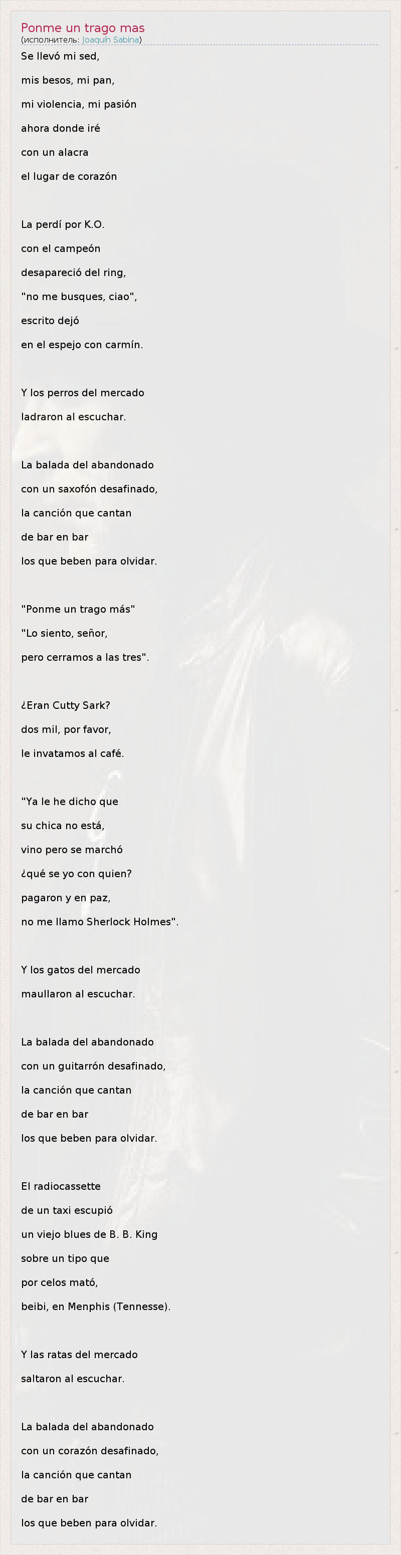 Это интересно:Хоаки́н Рамо́н Марти́нес Саби́на (исп. Joaquín Ramón Martínez Sabina, род. 12 февраля 1949, Убеда, Испания) — испанский рок-поэт, певец, композитор; один из столпов современной испаноязычной поп и рок-культуры. Автор-исполнитель, поставивший своё имя в один ряд с именами Боба Дилана, Жака Бреля, Сержа Генсбура или Бориса Гребенщикова, сходным образом оказавших влияние на культуру стран родного языка.Родился... продолжение