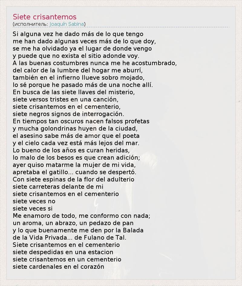 Si alguna vez he dado más de lo que tengo me han dado algunas veces más de lo que doy, se me ha olvidado ya el lugar de donde vengo y puede que no exista el sitio adonde voy. A las buenas costumbres nunca me he acostumbrado, del calor de la lumbre del hogar me aburrí, también en el infierno llueve sobro mojado, lo sé porque he pasado más de una noche allí. En busca de las siete llaves del misterio, siete versos tristes en una canción, siete crisantemos en el cementerio, siete negros signos de interrogación. En tiempos tan oscuros nacen falsos profetas y mucha golondrinas huyen de la ciudad, el asesino sabe más de amor que el poeta y el cielo cada vez está más lejos del mar. Lo bueno de los años es curan heridas, lo malo de los besos es que crean adición; ayer quiso matarme la mujer de mi vida, apretaba el gatillo... cuando se despertó. Con siete espinas de la flor del adulterio siete carreteras delante de mi siete crisantemos en el cementerio siete veces no siete veces si Me enamoro de todo, me conformo con nada; un aroma, un abrazo, un pedazo de pan y lo que buenamente me den por la Balada de la Vida Privada... de Fulano de Tal. Siete crisantemos en el cementerio siete despedidas en una estacion siete crisantemos en un cementerio siete cardenales en el corazón