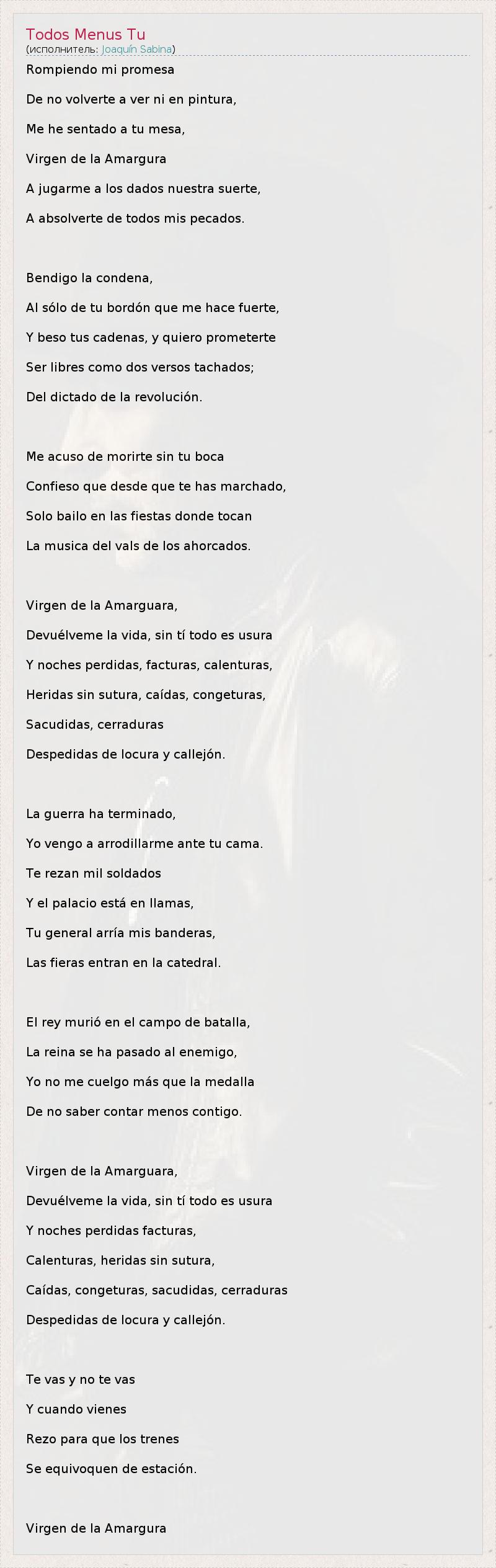 Это интересно:Хоаки́н Рамо́н Марти́нес Саби́на (исп. Joaquín Ramón Martínez Sabina, род. 12 февраля 1949, Убеда, Испания) — испанский рок-поэт, певец, композитор; один из столпов современной испаноязычной поп и рок-культуры. Автор-исполнитель, поставивший своё имя в один ряд с именами Боба Дилана, Жака Бреля, Сержа Генсбура или Бориса Гребенщикова, сходным образом оказавших влияние на культуру стран родного языка.Родился... продолжение