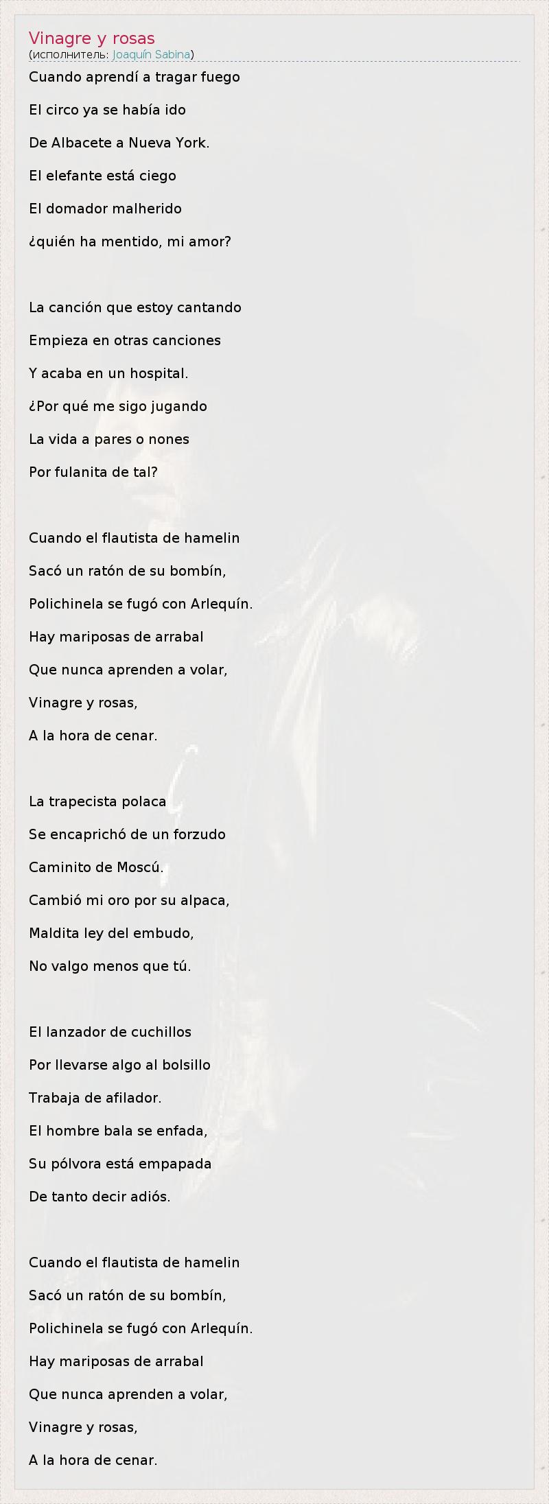 Cuando aprendí a tragar fuego El circo ya se había ido De Albacete a Nueva York. El elefante está ciego El domador malherido ¿quién ha mentido, mi amor? La canción que estoy cantando Empieza en otras canciones Y acaba en un hospital. ¿Por qué me sigo jugando La vida a pares o nones Por fulanita de tal? Cuando el flautista de hamelin Sacó un ratón de su bombín, Polichinela se fugó con Arlequín. Hay mariposas de arrabal Que nunca aprenden a volar, Vinagre y rosas, A la hora de cenar. La trapecista polaca Se encaprichó de un forzudo Caminito de Moscú. Cambió mi oro por su alpaca, Maldita ley del embudo, No valgo menos que tú. El lanzador de cuchillos Por llevarse algo al bolsillo Trabaja de afilador. El hombre bala se enfada, Su pólvora está empapada De tanto decir adiós. Cuando el flautista de hamelin Sacó un ratón de su bombín, Polichinela se fugó con Arlequín. Hay mariposas de arrabal Que nunca aprenden a volar, Vinagre y rosas, A la hora de cenar.