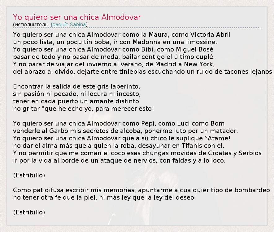 ГлавнаяИсполнителиJoaquín SabinaYo quiero ser una chica Almodovar