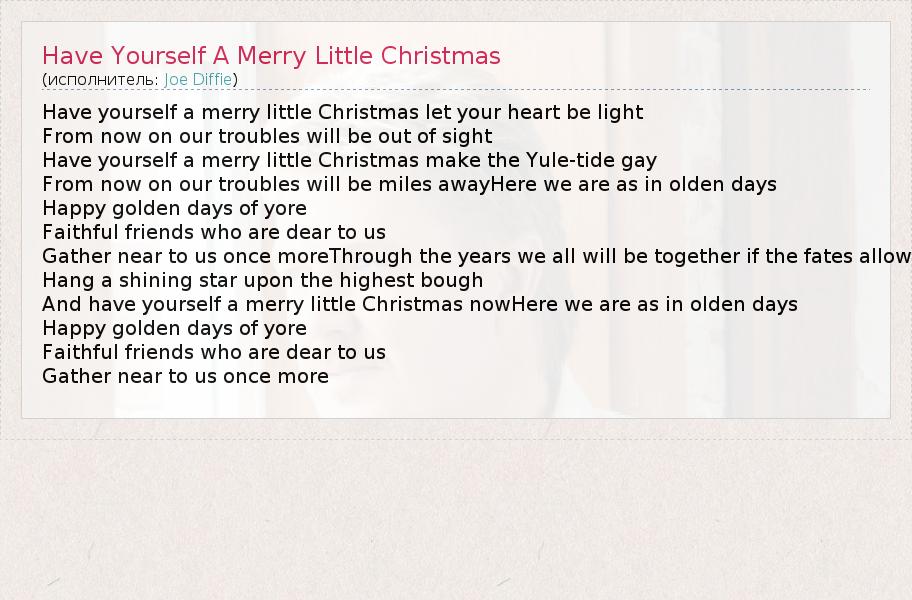 Have yourself a merry little Christmas let your heart be light From now on our troubles will be out of sight Have yourself a merry little Christmas make the Yule-tide gay From now on our troubles will be miles awayHere we are as in olden days Happy golden days of yore Faithful friends who are dear to us Gather near to us once moreThrough the years we all will be together if the fates allow Hang a shining star upon the highest bough And have yourself a merry little Christmas nowHere we are as in olden days Happy golden days of yore Faithful friends who are dear to us Gather near to us once more