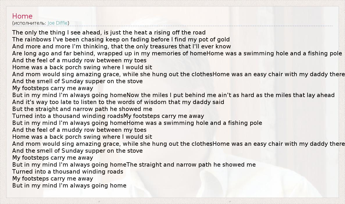 The only the thing I see ahead, is just the heat a rising off the road The rainbows I've been chasing keep on fading before I find my pot of gold And more and more I'm thinking, that the only treasures that I'll ever know Are long ago and far behind, wrapped up in my memories of homeHome was a swimming hole and a fishing pole And the feel of a muddy row between my toes Home was a back porch swing where I would sit And mom would sing amazing grace, while she hung out the clothesHome was an easy chair with my daddy there And the smell of Sunday supper on the stove My footsteps carry me away But in my mind I'm always going homeNow the miles I put behind me ain't as hard as the miles that lay ahead And it's way too late to listen to the words of wisdom that my daddy said But the straight and narrow path he showed me Turned into a thousand winding roadsMy footsteps carry me away But in my mind I'm always going homeHome was a swimming hole and a fishing pole And the feel of a muddy row between my toes Home was a back porch swing where I would sit And mom would sing amazing grace, while she hung out the clothesHome was an easy chair with my daddy there And the smell of Sunday supper on the stove My footsteps carry me away But in my mind I'm always going homeThe straight and narrow path he showed me Turned into a thousand winding roads My footsteps carry me away But in my mind I'm always going home