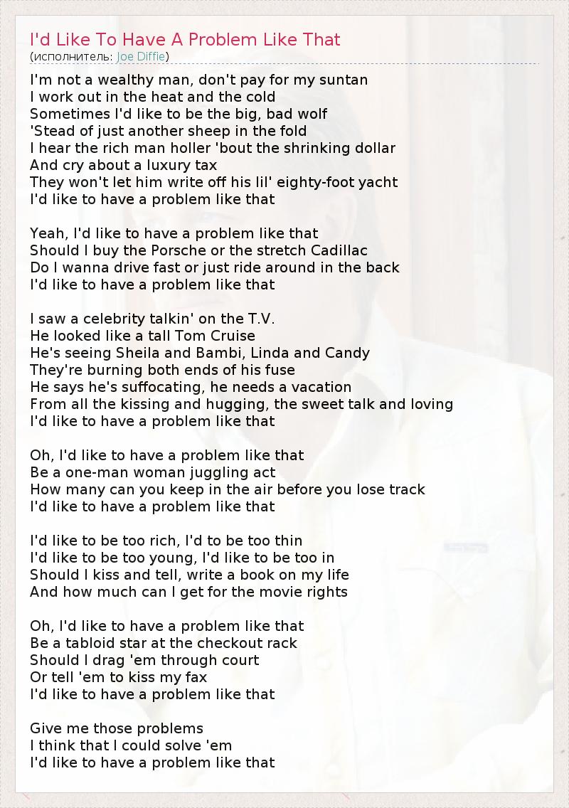 А как ты думаешь, о чем песня "I'd Like To Have A Problem Like That" ?
