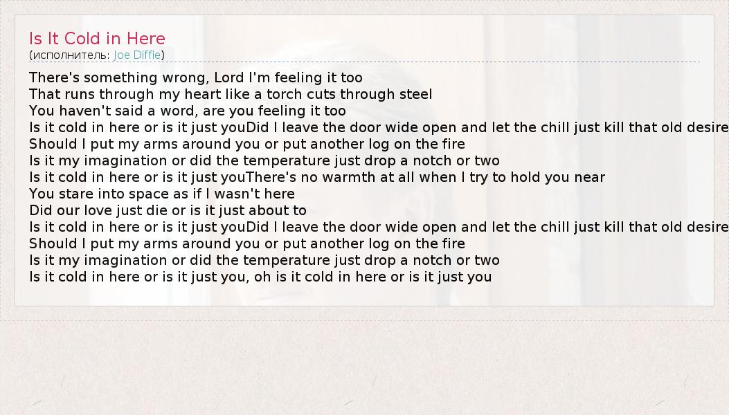 There's something wrong, Lord I'm feeling it too That runs through my heart like a torch cuts through steel You haven't said a word, are you feeling it too Is it cold in here or is it just youDid I leave the door wide open and let the chill just kill that old desire Should I put my arms around you or put another log on the fire Is it my imagination or did the temperature just drop a notch or two Is it cold in here or is it just youThere's no warmth at all when I try to hold you near You stare into space as if I wasn't here Did our love just die or is it just about to Is it cold in here or is it just youDid I leave the door wide open and let the chill just kill that old desire Should I put my arms around you or put another log on the fire Is it my imagination or did the temperature just drop a notch or two Is it cold in here or is it just you, oh is it cold in here or is it just you