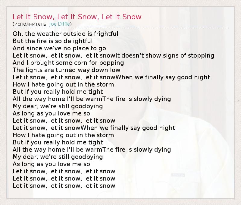 Oh, the weather outside is frightful But the fire is so delightful And since we've no place to go Let it snow, let it snow, let it snowIt doesn't show signs of stopping And I brought some corn for popping The lights are turned way down low Let it snow, let it snow, let it snowWhen we finally say good night How I hate going out in the storm But if you really hold me tight All the way home I'll be warmThe fire is slowly dying My dear, we're still goodbying As long as you love me so Let it snow, let it snow, let it snow Let it snow, let it snowWhen we finally say good night How I hate going out in the storm But if you really hold me tight All the way home I'll be warmThe fire is slowly dying My dear, we're still goodbying As long as you love me so Let it snow, let it snow, let it snow Let it snow, let it snow, let it snow Let it snow, let it snow, let it snow