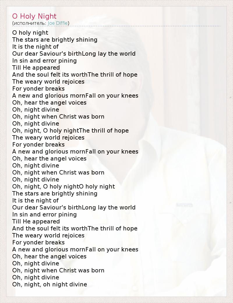 O holy night The stars are brightly shining It is the night of Our dear Saviour's birthLong lay the world In sin and error pining Till He appeared And the soul felt its worthThe thrill of hope The weary world rejoices For yonder breaks A new and glorious mornFall on your knees Oh, hear the angel voices Oh, night divine Oh, night when Christ was born Oh, night divine Oh, night, O holy nightThe thrill of hope The weary world rejoices For yonder breaks A new and glorious mornFall on your knees Oh, hear the angel voices Oh, night divine Oh, night when Christ was born Oh, night divine Oh, night, O holy nightO holy night The stars are brightly shining It is the night of Our dear Saviour's birthLong lay the world In sin and error pining Till He appeared And the soul felt its worthThe thrill of hope The weary world rejoices For yonder breaks A new and glorious mornFall on your knees Oh, hear the angel voices Oh, night divine Oh, night when Christ was born Oh, night divine Oh, night, oh night divine