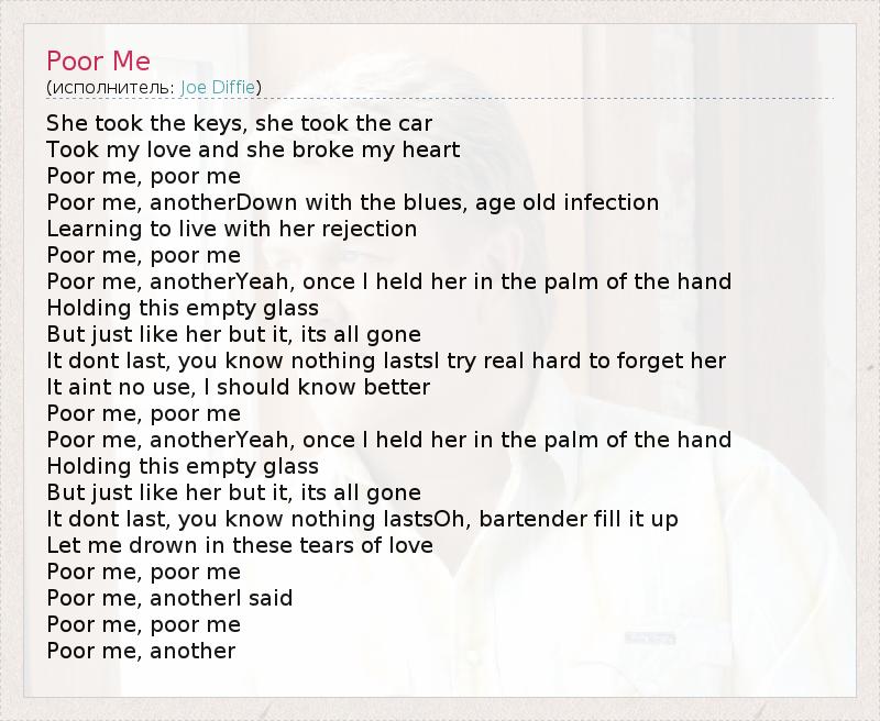 She took the keys, she took the car Took my love and she broke my heart Poor me, poor me Poor me, anotherDown with the blues, age old infection Learning to live with her rejection Poor me, poor me Poor me, anotherYeah, once I held her in the palm of the hand Holding this empty glass But just like her but it, its all gone It dont last, you know nothing lastsI try real hard to forget her It aint no use, I should know better Poor me, poor me Poor me, anotherYeah, once I held her in the palm of the hand Holding this empty glass But just like her but it, its all gone It dont last, you know nothing lastsOh, bartender fill it up Let me drown in these tears of love Poor me, poor me Poor me, anotherI said Poor me, poor me Poor me, another