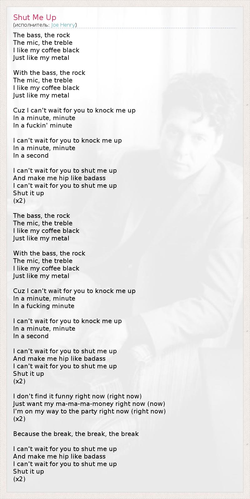 The bass, the rock The mic, the treble I like my coffee black Just like my metal With the bass, the rock The mic, the treble I like my coffee black Just like my metal Cuz I can't wait for you to knock me up In a minute, minute In a fuckin' minute I can't wait for you to knock me up In a minute, minute In a second I can't wait for you to shut me up And make me hip like badass I can't wait for you to shut me up Shut it up (x2) The bass, the rock The mic, the treble I like my coffee black Just like my metal With the bass, the rock The mic, the treble I like my coffee black Just like my metal Cuz I can't wait for you to knock me up In a minute, minute In a fucking minute I can't wait for you to knock me up In a minute, minute In a second I can't wait for you to shut me up And make me hip like badass I can't wait for you to shut me up Shut it up (x2) I don't find it funny right now (right now) Just want my ma-ma-ma-money right now (now) I'm on my way to the party right now (right now) (x2) Because the break, the break, the break I can't wait for you to shut me up And make me hip like badass I can't wait for you to shut me up Shut it up (x2)