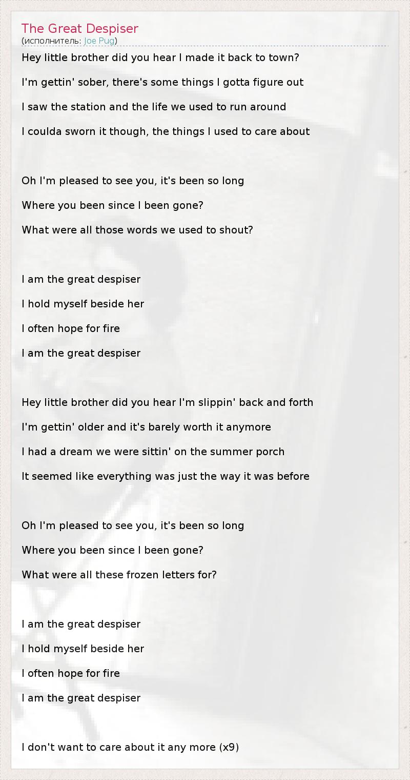 Hey little brother did you hear I made it back to town? I'm gettin' sober, there's some things I gotta figure out I saw the station and the life we used to run around I coulda sworn it though, the things I used to care about Oh I'm pleased to see you, it's been so long Where you been since I been gone? What were all those words we used to shout? I am the great despiser I hold myself beside her I often hope for fire I am the great despiser Hey little brother did you hear I'm slippin' back and forth I'm gettin' older and it's barely worth it anymore I had a dream we were sittin' on the summer porch It seemed like everything was just the way it was before Oh I'm pleased to see you, it's been so long Where you been since I been gone? What were all these frozen letters for? I am the great despiser I hold myself beside her I often hope for fire I am the great despiser I don't want to care about it any more (x9)