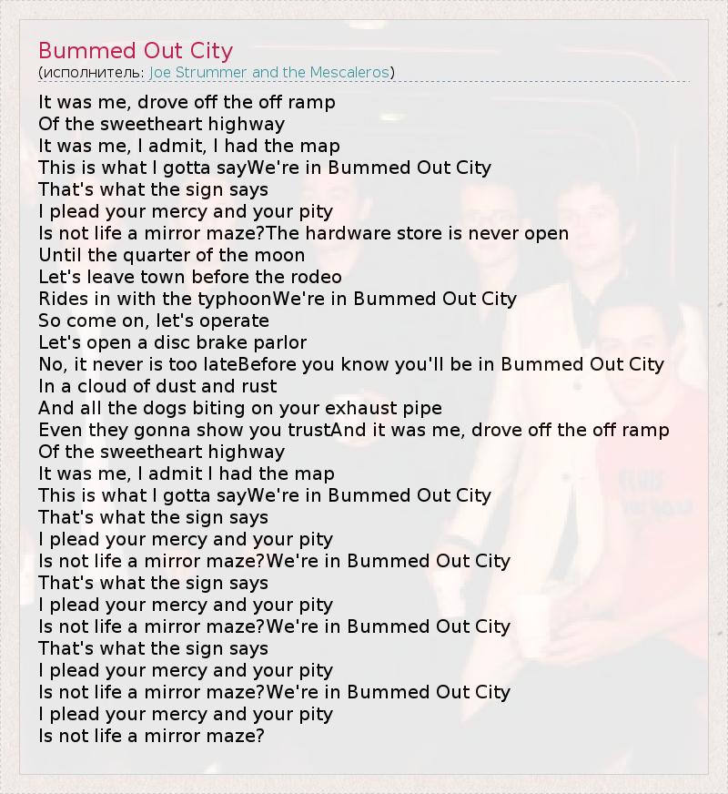 It was me, drove off the off ramp Of the sweetheart highway It was me, I admit, I had the map This is what I gotta sayWe're in Bummed Out City That's what the sign says I plead your mercy and your pity Is not life a mirror maze?The hardware store is never open Until the quarter of the moon Let's leave town before the rodeo Rides in with the typhoonWe're in Bummed Out City So come on, let's operate Let's open a disc brake parlor No, it never is too lateBefore you know you'll be in Bummed Out City In a cloud of dust and rust And all the dogs biting on your exhaust pipe Even they gonna show you trustAnd it was me, drove off the off ramp Of the sweetheart highway It was me, I admit I had the map This is what I gotta sayWe're in Bummed Out City That's what the sign says I plead your mercy and your pity Is not life a mirror maze?We're in Bummed Out City That's what the sign says I plead your mercy and your pity Is not life a mirror maze?We're in Bummed Out City That's what the sign says I plead your mercy and your pity Is not life a mirror maze?We're in Bummed Out City I plead your mercy and your pity Is not life a mirror maze?