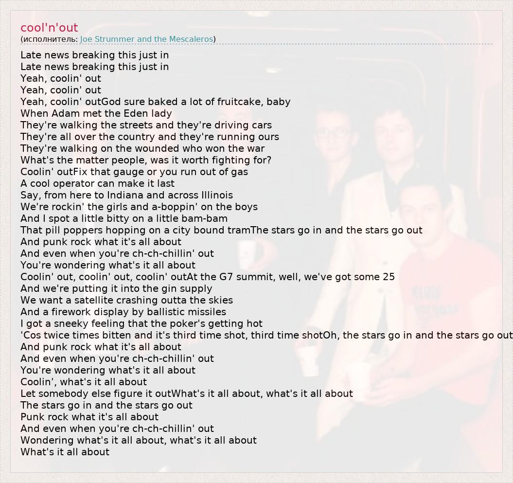 Late news breaking this just in Late news breaking this just in Yeah, coolin' out Yeah, coolin' out Yeah, coolin' outGod sure baked a lot of fruitcake, baby When Adam met the Eden lady They're walking the streets and they're driving cars They're all over the country and they're running ours They're walking on the wounded who won the war What's the matter people, was it worth fighting for? Coolin' outFix that gauge or you run out of gas A cool operator can make it last Say, from here to Indiana and across Illinois We're rockin' the girls and a-boppin' on the boys And I spot a little bitty on a little bam-bam That pill poppers hopping on a city bound tramThe stars go in and the stars go out And punk rock what it's all about And even when you're ch-ch-chillin' out You're wondering what's it all about Coolin' out, coolin' out, coolin' outAt the G7 summit, well, we've got some 25 And we're putting it into the gin supply We want a satellite crashing outta the skies And a firework display by ballistic missiles I got a sneeky feeling that the poker's getting hot 'Cos twice times bitten and it's third time shot, third time shotOh, the stars go in and the stars go out And punk rock what it's all about And even when you're ch-ch-chillin' out You're wondering what's it all about Coolin', what's it all about Let somebody else figure it outWhat's it all about, what's it all about The stars go in and the stars go out Punk rock what it's all about And even when you're ch-ch-chillin' out Wondering what's it all about, what's it all about What's it all about