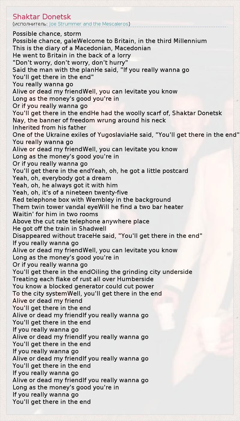 Possible chance, storm Possible chance, galeWelcome to Britain, in the third Millennium This is the diary of a Macedonian, Macedonian He went to Britain in the back of a lorry "Don't worry, don't worry, don't hurry" Said the man with the planHe said, "If you really wanna go You'll get there in the end" You really wanna go Alive or dead my friendWell, you can levitate you know Long as the money's good you're in Or if you really wanna go You'll get there in the endHe had the woolly scarf of, Shaktar Donetsk Nay, the banner of freedom wrung around his neck Inherited from his father One of the Ukraine exiles of YugoslaviaHe said, "You'll get there in the end" You really wanna go Alive or dead my friendWell, you can levitate you know Long as the money's good you're in Or if you really wanna go You'll get there in the endYeah, oh, he got a little postcard Yeah, oh, everybody got a dream Yeah, oh, he always got it with him Yeah, oh, it's of a nineteen twenty-five Red telephone box with Wembley in the background Them twin tower vandal eyeWill he find a two bar heater Waitin' for him in two rooms Above the cut rate telephone anywhere place He got off the train in Shadwell Disappeared without traceHe said, "You'll get there in the end" If you really wanna go Alive or dead my friendWell, you can levitate you know Long as the money's good you're in Or if you really wanna go You'll get there in the endOiling the grinding city underside Treating each flake of rust all over Humberside You know a blocked generator could cut power To the city systemWell, you'll get there in the end Alive or dead my friend You'll get there in the end Alive or dead my friendIf you really wanna go You'll get there in the end If you really wanna go Alive or dead my friendIf you really wanna go You'll get there in the end If you really wanna go Alive or dead my friendIf you really wanna go You'll get there in the end If you really wanna go Alive or dead my friendIf you really wanna go Long as the money's good you're in If you really wanna go You'll get there in the end