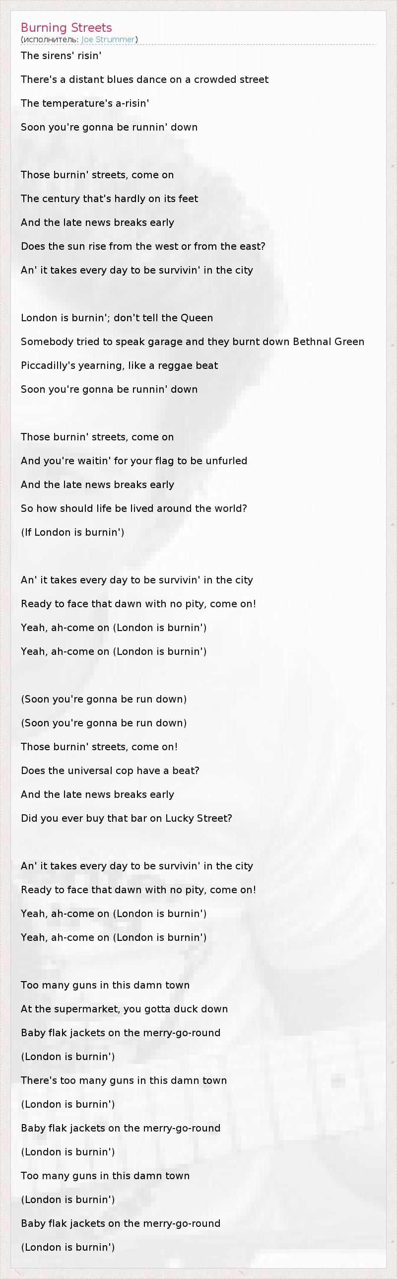 The sirens' risin' There's a distant blues dance on a crowded street The temperature's a-risin' Soon you're gonna be runnin' down Those burnin' streets, come on The century that's hardly on its feet And the late news breaks early Does the sun rise from the west or from the east? An' it takes every day to be survivin' in the city London is burnin'; don't tell the Queen Somebody tried to speak garage and they burnt down Bethnal Green Piccadilly's yearning, like a reggae beat Soon you're gonna be runnin' down Those burnin' streets, come on And you're waitin' for your flag to be unfurled And the late news breaks early So how should life be lived around the world? (If London is burnin') An' it takes every day to be survivin' in the city Ready to face that dawn with no pity, come on! Yeah, ah-come on (London is burnin') Yeah, ah-come on (London is burnin') (Soon you're gonna be run down) (Soon you're gonna be run down) Those burnin' streets, come on! Does the universal cop have a beat? And the late news breaks early Did you ever buy that bar on Lucky Street? An' it takes every day to be survivin' in the city Ready to face that dawn with no pity, come on! Yeah, ah-come on (London is burnin') Yeah, ah-come on (London is burnin') Too many guns in this damn town At the supermarket, you gotta duck down Baby flak jackets on the merry-go-round (London is burnin') There's too many guns in this damn town (London is burnin') Baby flak jackets on the merry-go-round (London is burnin') Too many guns in this damn town (London is burnin') Baby flak jackets on the merry-go-round (London is burnin')