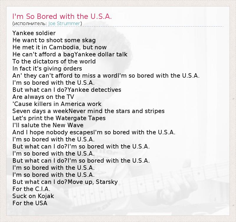 Yankee soldier He want to shoot some skag He met it in Cambodia, but now He can't afford a bagYankee dollar talk To the dictators of the world In fact it's giving orders An' they can't afford to miss a wordI'm so bored with the U.S.A. I'm so bored with the U.S.A. But what can I do?Yankee detectives Are always on the TV 'Cause killers in America work Seven days a weekNever mind the stars and stripes Let's print the Watergate Tapes I'll salute the New Wave And I hope nobody escapesI'm so bored with the U.S.A. I'm so bored with the U.S.A. But what can I do?I'm so bored with the U.S.A. I'm so bored with the U.S.A. But what can I do?I'm so bored with the U.S.A. I'm so bored with the U.S.A. I'm so bored with the U.S.A. But what can I do?Move up, Starsky For the C.I.A. Suck on Kojak For the USA