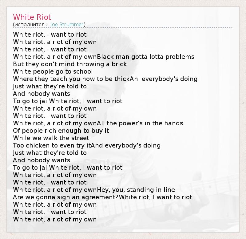 White riot, I want to riot White riot, a riot of my own White riot, I want to riot White riot, a riot of my ownBlack man gotta lotta problems But they don't mind throwing a brick White people go to school Where they teach you how to be thickAn' everybody's doing Just what they're told to And nobody wants To go to jailWhite riot, I want to riot White riot, a riot of my own White riot, I want to riot White riot, a riot of my ownAll the power's in the hands Of people rich enough to buy it While we walk the street Too chicken to even try itAnd everybody's doing Just what they're told to And nobody wants To go to jailWhite riot, I want to riot White riot, a riot of my own White riot, I want to riot White riot, a riot of my ownHey, you, standing in line Are we gonna sign an agreement?White riot, I want to riot White riot, a riot of my own White riot, I want to riot White riot, a riot of my own