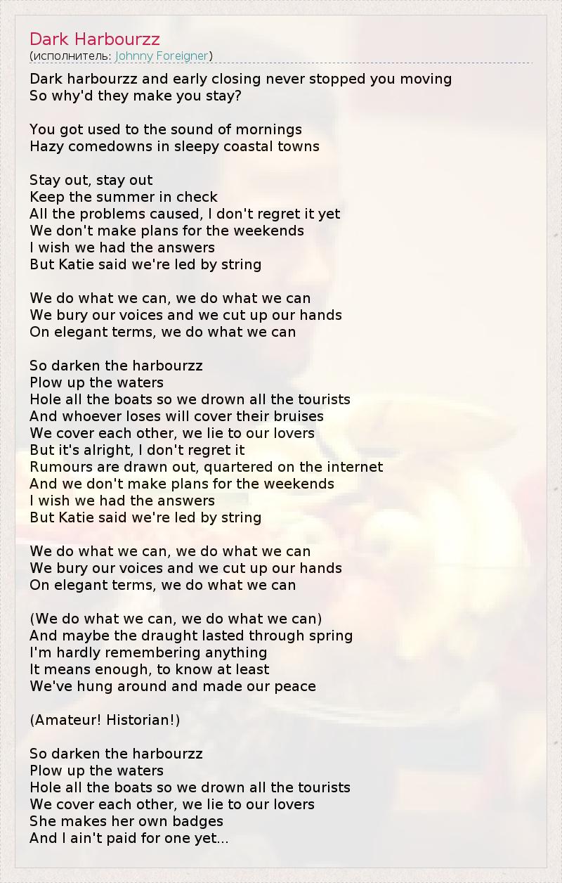 Dark harbourzz and early closing never stopped you moving So why'd they make you stay? You got used to the sound of mornings Hazy comedowns in sleepy coastal towns Stay out, stay out Keep the summer in check All the problems caused, I don't regret it yet We don't make plans for the weekends I wish we had the answers But Katie said we're led by string We do what we can, we do what we can We bury our voices and we cut up our hands On elegant terms, we do what we can So darken the harbourzz Plow up the waters Hole all the boats so we drown all the tourists And whoever loses will cover their bruises We cover each other, we lie to our lovers But it's alright, I don't regret it Rumours are drawn out, quartered on the internet And we don't make plans for the weekends I wish we had the answers But Katie said we're led by string We do what we can, we do what we can We bury our voices and we cut up our hands On elegant terms, we do what we can (We do what we can, we do what we can) And maybe the draught lasted through spring I'm hardly remembering anything It means enough, to know at least We've hung around and made our peace (Amateur! Historian!) So darken the harbourzz Plow up the waters Hole all the boats so we drown all the tourists We cover each other, we lie to our lovers She makes her own badges And I ain't paid for one yet...