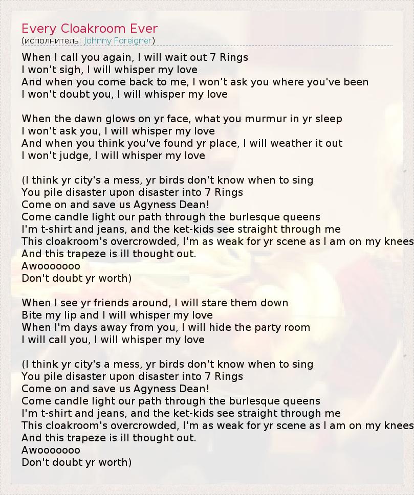 When I call you again, I will wait out 7 Rings I won't sigh, I will whisper my love And when you come back to me, I won't ask you where you've been I won't doubt you, I will whisper my love When the dawn glows on yr face, what you murmur in yr sleep I won't ask you, I will whisper my love And when you think you've found yr place, I will weather it out I won't judge, I will whisper my love (I think yr city's a mess, yr birds don't know when to sing You pile disaster upon disaster into 7 Rings Come on and save us Agyness Dean! Come candle light our path through the burlesque queens I'm t-shirt and jeans, and the ket-kids see straight through me This cloakroom's overcrowded, I'm as weak for yr scene as I am on my knees And this trapeze is ill thought out. Awooooooo Don't doubt yr worth) When I see yr friends around, I will stare them down Bite my lip and I will whisper my love When I'm days away from you, I will hide the party room I will call you, I will whisper my love (I think yr city's a mess, yr birds don't know when to sing You pile disaster upon disaster into 7 Rings Come on and save us Agyness Dean! Come candle light our path through the burlesque queens I'm t-shirt and jeans, and the ket-kids see straight through me This cloakroom's overcrowded, I'm as weak for yr scene as I am on my knees And this trapeze is ill thought out. Awooooooo Don't doubt yr worth)