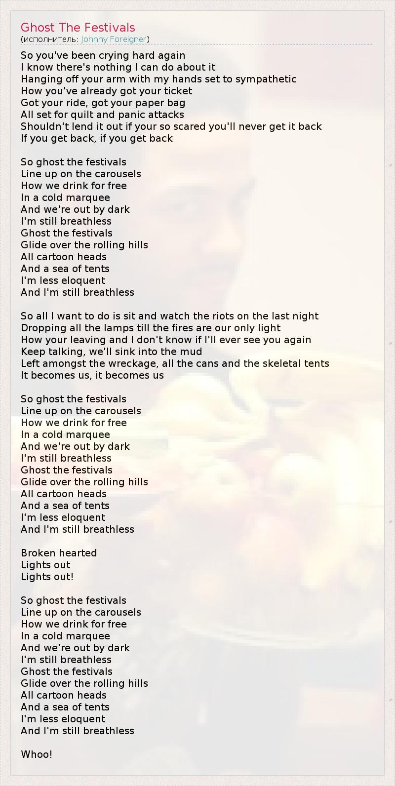 So you've been crying hard again I know there's nothing I can do about it Hanging off your arm with my hands set to sympathetic How you've already got your ticket Got your ride, got your paper bag All set for quilt and panic attacks Shouldn't lend it out if your so scared you'll never get it back If you get back, if you get back So ghost the festivals Line up on the carousels How we drink for free In a cold marquee And we're out by dark I'm still breathless Ghost the festivals Glide over the rolling hills All cartoon heads And a sea of tents I'm less eloquent And I'm still breathless So all I want to do is sit and watch the riots on the last night Dropping all the lamps till the fires are our only light How your leaving and I don't know if I'll ever see you again Keep talking, we'll sink into the mud Left amongst the wreckage, all the cans and the skeletal tents It becomes us, it becomes us So ghost the festivals Line up on the carousels How we drink for free In a cold marquee And we're out by dark I'm still breathless Ghost the festivals Glide over the rolling hills All cartoon heads And a sea of tents I'm less eloquent And I'm still breathless Broken hearted Lights out Lights out! So ghost the festivals Line up on the carousels How we drink for free In a cold marquee And we're out by dark I'm still breathless Ghost the festivals Glide over the rolling hills All cartoon heads And a sea of tents I'm less eloquent And I'm still breathless Whoo!