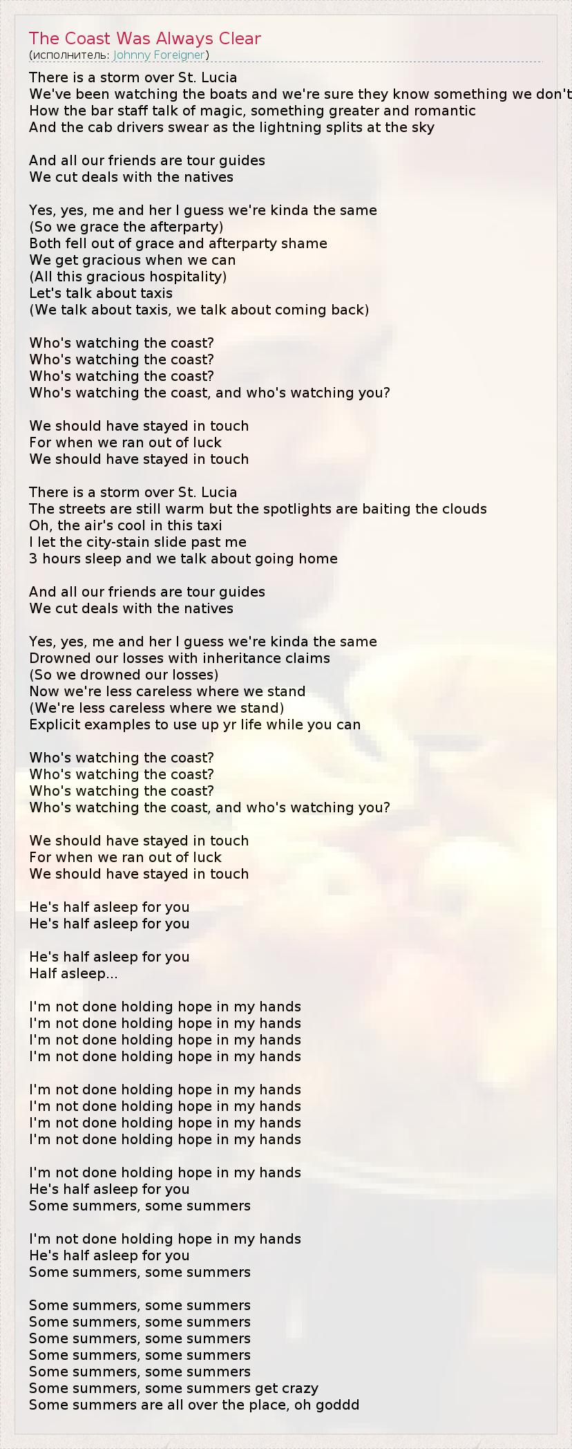 There is a storm over St. Lucia We've been watching the boats and we're sure they know something we don't How the bar staff talk of magic, something greater and romantic And the cab drivers swear as the lightning splits at the sky And all our friends are tour guides We cut deals with the natives Yes, yes, me and her I guess we're kinda the same (So we grace the afterparty) Both fell out of grace and afterparty shame We get gracious when we can (All this gracious hospitality) Let's talk about taxis (We talk about taxis, we talk about coming back) Who's watching the coast? Who's watching the coast? Who's watching the coast? Who's watching the coast, and who's watching you? We should have stayed in touch For when we ran out of luck We should have stayed in touch There is a storm over St. Lucia The streets are still warm but the spotlights are baiting the clouds Oh, the air's cool in this taxi I let the city-stain slide past me 3 hours sleep and we talk about going home And all our friends are tour guides We cut deals with the natives Yes, yes, me and her I guess we're kinda the same Drowned our losses with inheritance claims (So we drowned our losses) Now we're less careless where we stand (We're less careless where we stand) Explicit examples to use up yr life while you can Who's watching the coast? Who's watching the coast? Who's watching the coast? Who's watching the coast, and who's watching you? We should have stayed in touch For when we ran out of luck We should have stayed in touch He's half asleep for you He's half asleep for you He's half asleep for you Half asleep... I'm not done holding hope in my hands I'm not done holding hope in my hands I'm not done holding hope in my hands I'm not done holding hope in my hands I'm not done holding hope in my hands I'm not done holding hope in my hands I'm not done holding hope in my hands I'm not done holding hope in my hands I'm not done holding hope in my hands He's half asleep for you Some summers, some summers I'm not done holding hope in my hands He's half asleep for you Some summers, some summers Some summers, some summers Some summers, some summers Some summers, some summers Some summers, some summers Some summers, some summers Some summers, some summers get crazy Some summers are all over the place, oh goddd
