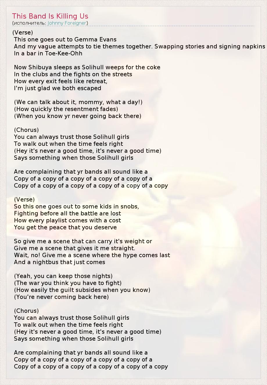 (Verse) This one goes out to Gemma Evans And my vague attempts to tie themes together. Swapping stories and signing napkins In a bar in Toe-Kee-Ohh Now Shibuya sleeps as Solihull weeps for the coke In the clubs and the fights on the streets How every exit feels like retreat, I'm just glad we both escaped (We can talk about it, mommy, what a day!) (How quickly the resentment fades) (When you know yr never going back there) (Chorus) You can always trust those Solihull girls To walk out when the time feels right (Hey it's never a good time, it's never a good time) Says something when those Solihull girls Are complaining that yr bands all sound like a Copy of a copy of a copy of a copy of a copy of a Copy of a copy of a copy of a copy of a copy of a copy (Verse) So this one goes out to some kids in snobs, Fighting before all the battle are lost How every playlist comes with a cost You get the peace that you deserve So give me a scene that can carry it's weight or Give me a scene that gives it me straight. Wait, no! Give me a scene where the hype comes last And a nightbus that just comes (Yeah, you can keep those nights) (The war you think you have to fight) (How easily the guilt subsides when you know) (You're never coming back here) (Chorus) You can always trust those Solihull girls To walk out when the time feels right (Hey it's never a good time, it's never a good time) Says something when those Solihull girls Are complaining that yr bands all sound like a Copy of a copy of a copy of a copy of a copy of a Copy of a copy of a copy of a copy of a copy of a copy
