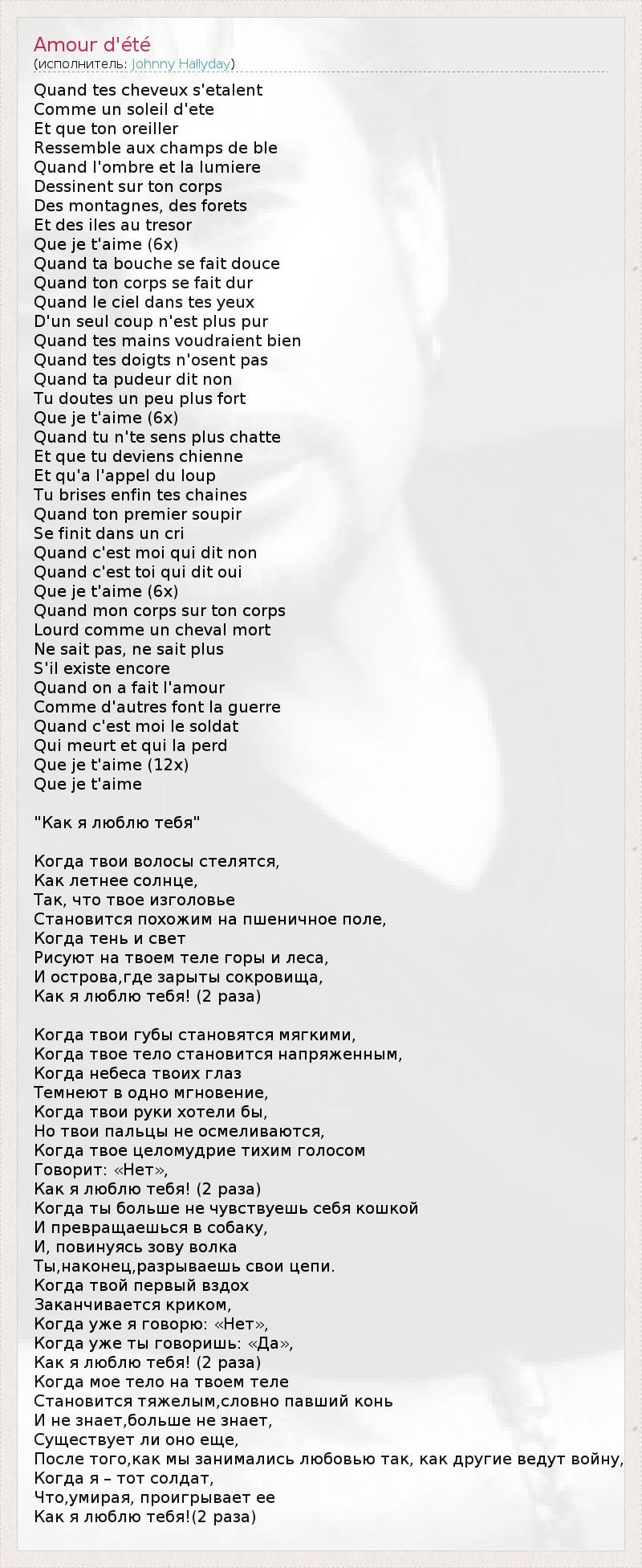 Quand tes cheveux s'etalent Comme un soleil d'ete Et que ton oreiller Ressemble aux champs de ble Quand l'ombre et la lumiere Dessinent sur ton corps Des montagnes, des forets Et des iles au tresor Que je t'aime (6x) Quand ta bouche se fait douce Quand ton corps se fait dur Quand le ciel dans tes yeux D'un seul coup n'est plus pur Quand tes mains voudraient bien Quand tes doigts n'osent pas Quand ta pudeur dit non Tu doutes un peu plus fort Que je t'aime (6x) Quand tu n'te sens plus chatte Et que tu deviens chienne Et qu'a l'appel du loup Tu brises enfin tes chaines Quand ton premier soupir Se finit dans un cri Quand c'est moi qui dit non Quand c'est toi qui dit oui Que je t'aime (6x) Quand mon corps sur ton corps Lourd comme un cheval mort Ne sait pas, ne sait plus S'il existe encore Quand on a fait l'amour Comme d'autres font la guerre Quand c'est moi le soldat Qui meurt et qui la perd Que je t'aime (12x) Que je t'aime "Как я люблю тебя" Когда твои волосы стелятся, Как летнее солнце, Так, что твое изголовье Становится похожим на пшеничное поле, Когда тень и свет Рисуют на твоем теле горы и леса, И острова,где зарыты сокровища, Как я люблю тебя! (2 раза) Когда твои губы становятся мягкими, Когда твое тело становится напряженным, Когда небеса твоих глаз Темнеют в одно мгновение, Когда твои руки хотели бы, Но твои пальцы не осмеливаются, Когда твое целомудрие тихим голосом Говорит: «Нет», Как я люблю тебя! (2 раза) Когда ты больше не чувствуешь себя кошкой И превращаешься в собаку, И, повинуясь зову волка Ты,наконец,разрываешь свои цепи. Когда твой первый вздох Заканчивается криком, Когда уже я говорю: «Нет», Когда уже ты говоришь: «Да», Как я люблю тебя! (2 раза) Когда мое тело на твоем теле Становится тяжелым,словно павший конь И не знает,больше не знает, Существует ли оно еще, После того,как мы занимались любовью так, как другие ведут войну, Когда я – тот солдат, Что,умирая, проигрывает ее Как я люблю тебя!(2 раза)