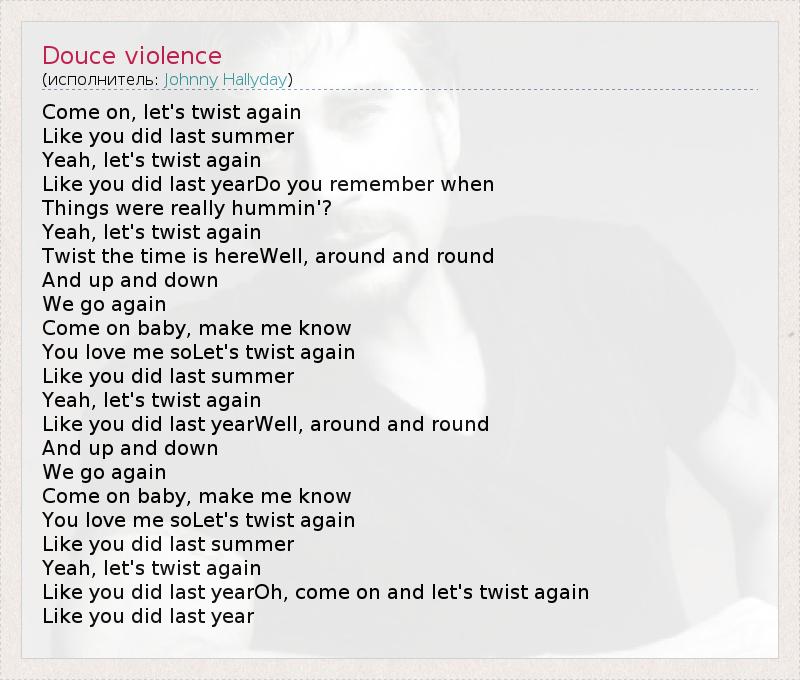 Come on, let's twist again Like you did last summer Yeah, let's twist again Like you did last yearDo you remember when Things were really hummin'? Yeah, let's twist again Twist the time is hereWell, around and round And up and down We go again Come on baby, make me know You love me soLet's twist again Like you did last summer Yeah, let's twist again Like you did last yearWell, around and round And up and down We go again Come on baby, make me know You love me soLet's twist again Like you did last summer Yeah, let's twist again Like you did last yearOh, come on and let's twist again Like you did last year