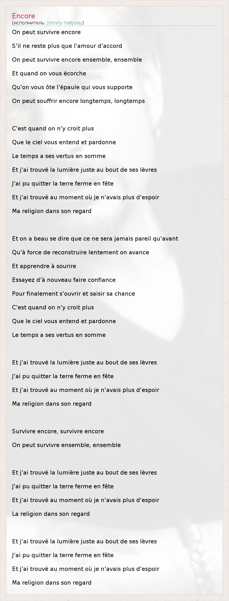 On peut survivre encore S'il ne reste plus que l'amour d'accord On peut survivre encore ensemble, ensemble Et quand on vous écorche Qu'on vous ôte l'épaule qui vous supporte On peut souffrir encore longtemps, longtemps C'est quand on n'y croit plus Que le ciel vous entend et pardonne Le temps a ses vertus en somme Et j'ai trouvé la lumière juste au bout de ses lèvres J'ai pu quitter la terre ferme en fête Et j'ai trouvé au moment où je n'avais plus d'espoir Ma religion dans son regard Et on a beau se dire que ce ne sera jamais pareil qu'avant Qu'à force de reconstruire lentement on avance Et apprendre à sourire Essayez d'à nouveau faire confiance Pour finalement s'ouvrir et saisir sa chance C'est quand on n'y croit plus Que le ciel vous entend et pardonne Le temps a ses vertus en somme Et j'ai trouvé la lumière juste au bout de ses lèvres J'ai pu quitter la terre ferme en fête Et j'ai trouvé au moment où je n'avais plus d'espoir Ma religion dans son regard Survivre encore, survivre encore On peut survivre ensemble, ensemble Et j'ai trouvé la lumière juste au bout de ses lèvres J'ai pu quitter la terre ferme en fête Et j'ai trouvé au moment où je n'avais plus d'espoir La religion dans son regard Et j'ai trouvé la lumière juste au bout de ses lèvres J'ai pu quitter la terre ferme en fête Et j'ai trouvé au moment où je n'avais plus d'espoir Ma religion dans son regard