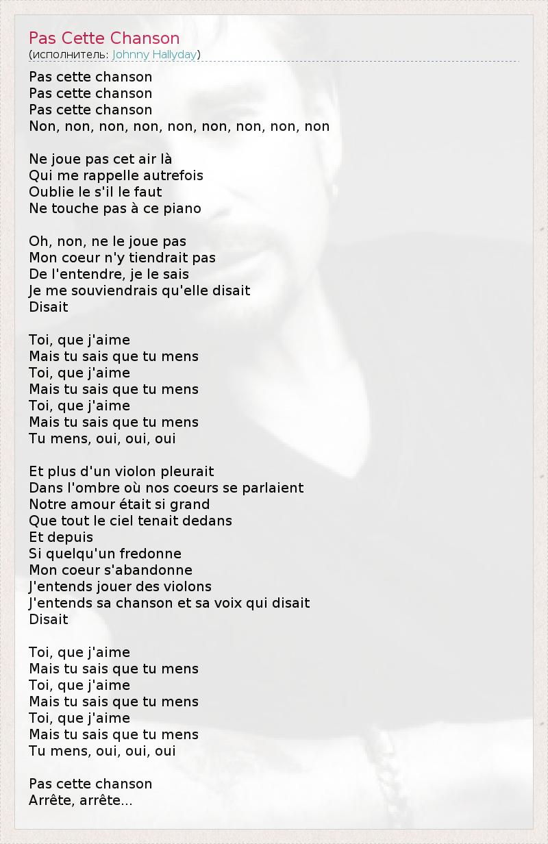 Pas cette chanson Pas cette chanson Pas cette chanson Non, non, non, non, non, non, non, non, non Ne joue pas cet air là Qui me rappelle autrefois Oublie le s'il le faut Ne touche pas à ce piano Oh, non, ne le joue pas Mon coeur n'y tiendrait pas De l'entendre, je le sais Je me souviendrais qu'elle disait Disait Toi, que j'aime Mais tu sais que tu mens Toi, que j'aime Mais tu sais que tu mens Toi, que j'aime Mais tu sais que tu mens Tu mens, oui, oui, oui Et plus d'un violon pleurait Dans l'ombre où nos coeurs se parlaient Notre amour était si grand Que tout le ciel tenait dedans Et depuis Si quelqu'un fredonne Mon coeur s'abandonne J'entends jouer des violons J'entends sa chanson et sa voix qui disait Disait Toi, que j'aime Mais tu sais que tu mens Toi, que j'aime Mais tu sais que tu mens Toi, que j'aime Mais tu sais que tu mens Tu mens, oui, oui, oui Pas cette chanson Arrête, arrête...