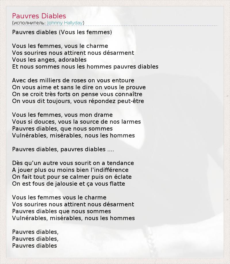 Бедолаги Pauvres diables Женщины – вы прелесть, Ваши улыбки нас манят, нас обезоруживают, Вы – очаровательные ангелы, И мы мужчины – бедняги Мы вас окружаем тысячами роз, Мы любим вас и, молча, вам это доказываем, Считаемся очень сильными, мы хотим познать вас, И говорим вам: Всегда, вы отвечаете: Возможно. Женщины – вы моя драма, Вы так милы, вы источник наших слез, Бедняги, мы такие Уязвимые, жалкие, мы – мужчины Бедняги, бедняги… Как только другой вам улыбнется, мы стремимся, Более менее изображая равнодушие, Сделать все, чтобы успокоиться, потом взрываемся, Сходим с ума от ревности, и это вам льстит. Женщины – вы прелесть, Ваши улыбки нас манят, нас обезоруживают, Бедняги, мы такие Уязвимые, несчастные, мы – мужчины. Бедняги, Бедняги, Бедняги.