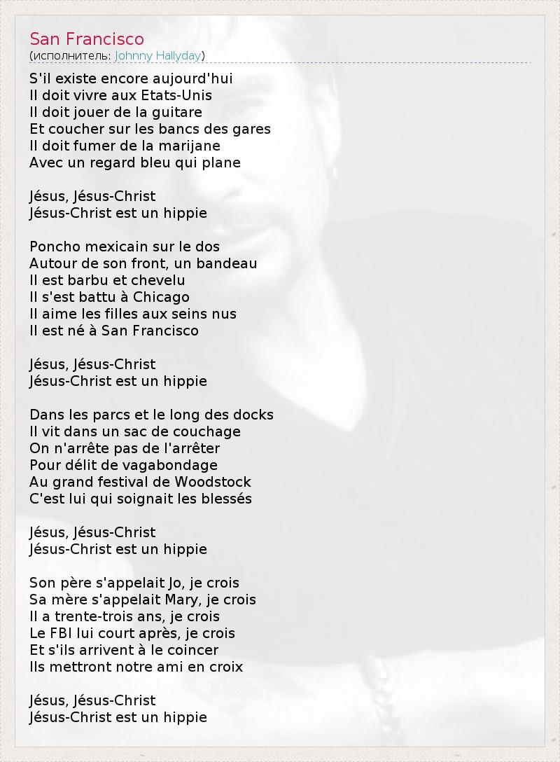 S'il existe encore aujourd'hui Il doit vivre aux Etats-Unis Il doit jouer de la guitare Et coucher sur les bancs des gares Il doit fumer de la marijane Avec un regard bleu qui plane Jésus, Jésus-Christ Jésus-Christ est un hippie Poncho mexicain sur le dos Autour de son front, un bandeau Il est barbu et chevelu Il s'est battu à Chicago Il aime les filles aux seins nus Il est né à San Francisco Jésus, Jésus-Christ Jésus-Christ est un hippie Dans les parcs et le long des docks Il vit dans un sac de couchage On n'arrête pas de l'arrêter Pour délit de vagabondage Au grand festival de Woodstock C'est lui qui soignait les blessés Jésus, Jésus-Christ Jésus-Christ est un hippie Son père s'appelait Jo, je crois Sa mère s'appelait Mary, je crois Il a trente-trois ans, je crois Le FBI lui court après, je crois Et s'ils arrivent à le coincer Ils mettront notre ami en croix Jésus, Jésus-Christ Jésus-Christ est un hippie