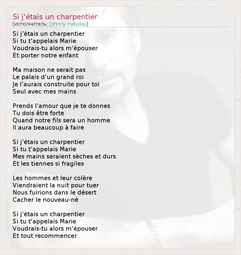 Если бы я был плотником, Если бы тебя звали Мари, Захотела бы ты взять меня в мужья И иметь от меня ребенка? Мой дом не был бы Дворцом знатного короля. Я бы построил его для тебя Своими руками. Возьми ту любовь, что я дарю тебе, Ты должна быть сильной. Когда наш сын станет мужчиной, Ему многое предстоит сделать. Если бы я был плотником, Если бы тебя звали Мари, Мои руки были бы сухи и грубы, А твои так нежны. Люди, охваченные гневом, Пришли бы ночью, убить нас. Мы бы убежали в пустыню Спрятать новорожденного. Если бы я был плотником, Если бы тебя звали Мари, Захотела бы ты взять меня в мужья И все начать сначала?