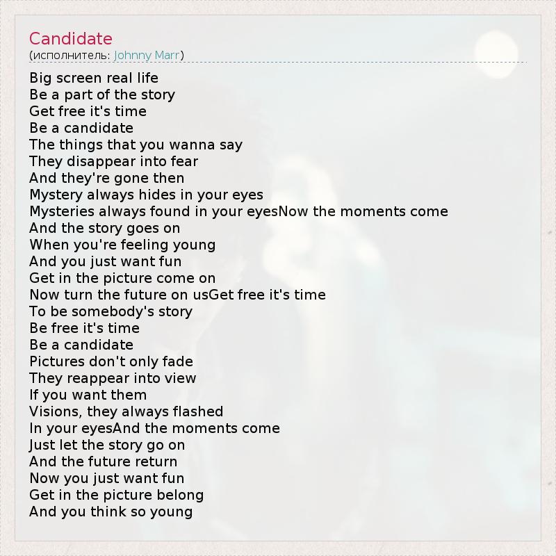 Big screen real life Be a part of the story Get free it's time Be a candidate The things that you wanna say They disappear into fear And they're gone then Mystery always hides in your eyes Mysteries always found in your eyesNow the moments come And the story goes on When you're feeling young And you just want fun Get in the picture come on Now turn the future on usGet free it's time To be somebody's story Be free it's time Be a candidate Pictures don't only fade They reappear into view If you want them Visions, they always flashed In your eyesAnd the moments come Just let the story go on And the future return Now you just want fun Get in the picture belong And you think so young