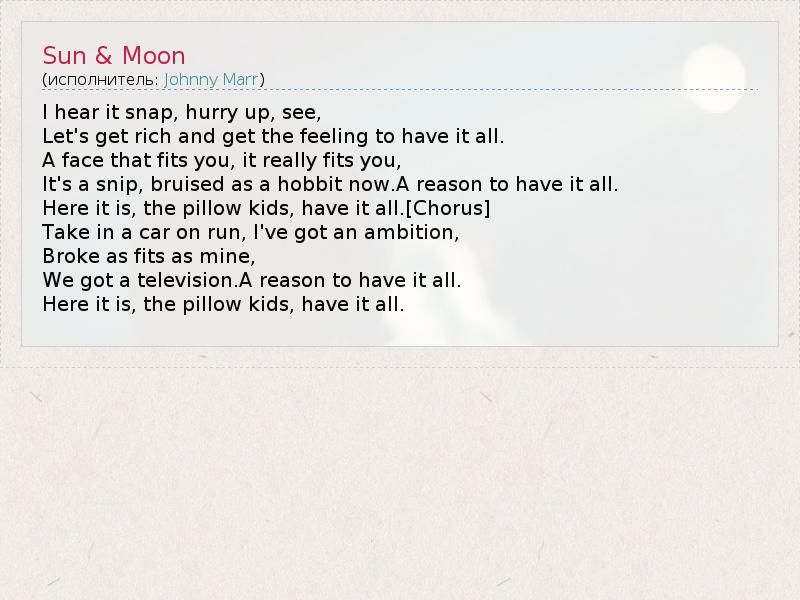 I hear it snap, hurry up, see, Let's get rich and get the feeling to have it all. A face that fits you, it really fits you, It's a snip, bruised as a hobbit now.A reason to have it all. Here it is, the pillow kids, have it all.[Chorus] Take in a car on run, I've got an ambition, Broke as fits as mine, We got a television.A reason to have it all. Here it is, the pillow kids, have it all.