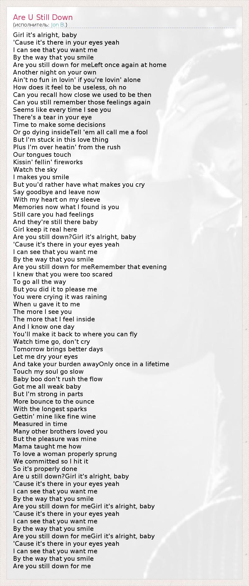 Girl it's alright, baby 'Cause it's there in your eyes yeah I can see that you want me By the way that you smile Are you still down for meLeft once again at home Another night on your own Ain't no fun in lovin' if you're lovin' alone How does it feel to be useless, oh no Can you recall how close we used to be then Can you still remember those feelings again Seems like every time I see you There's a tear in your eye Time to make some decisions Or go dying insideTell 'em all call me a fool But I'm stuck in this love thing Plus I'm over heatin' from the rush Our tongues touch Kissin' fellin' fireworks Watch the sky I makes you smile But you'd rather have what makes you cry Say goodbye and leave now With my heart on my sleeve Memories now what I found is you Still care you had feelings And they're still there baby Girl keep it real here Are you still down?Girl it's alright, baby 'Cause it's there in your eyes yeah I can see that you want me By the way that you smile Are you still down for meRemember that evening I knew that you were too scared To go all the way But you did it to please me You were crying it was raining When u gave it to me The more I see you The more that I feel inside And I know one day You'll make it back to where you can fly Watch time go, don't cry Tomorrow brings better days Let me dry your eyes And take your burden awayOnly once in a lifetime Touch my soul go slow Baby boo don't rush the flow Got me all weak baby But I'm strong in parts More bounce to the ounce With the longest sparks Gettin' mine like fine wine Measured in time Many other brothers loved you But the pleasure was mine Mama taught me how To love a woman properly sprung We committed so I hit it So it's properly done Are u still down?Girl it's alright, baby 'Cause it's there in your eyes yeah I can see that you want me By the way that you smile Are you still down for meGirl it's alright, baby 'Cause it's there in your eyes yeah I can see that you want me By the way that you smile Are you still down for meGirl it's alright, baby 'Cause it's there in your eyes yeah I can see that you want me By the way that you smile Are you still down for me