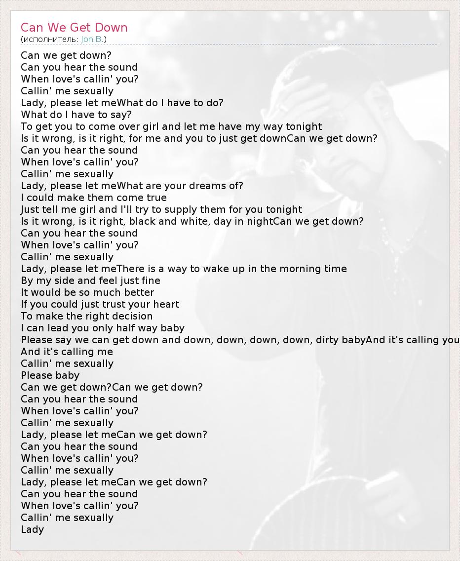 Can we get down? Can you hear the sound When love's callin' you? Callin' me sexually Lady, please let meWhat do I have to do? What do I have to say? To get you to come over girl and let me have my way tonight Is it wrong, is it right, for me and you to just get downCan we get down? Can you hear the sound When love's callin' you? Callin' me sexually Lady, please let meWhat are your dreams of? I could make them come true Just tell me girl and I'll try to supply them for you tonight Is it wrong, is it right, black and white, day in nightCan we get down? Can you hear the sound When love's callin' you? Callin' me sexually Lady, please let meThere is a way to wake up in the morning time By my side and feel just fine It would be so much better If you could just trust your heart To make the right decision I can lead you only half way baby Please say we can get down and down, down, down, down, dirty babyAnd it's calling you And it's calling me Callin' me sexually Please baby Can we get down?Can we get down? Can you hear the sound When love's callin' you? Callin' me sexually Lady, please let meCan we get down? Can you hear the sound When love's callin' you? Callin' me sexually Lady, please let meCan we get down? Can you hear the sound When love's callin' you? Callin' me sexually Lady