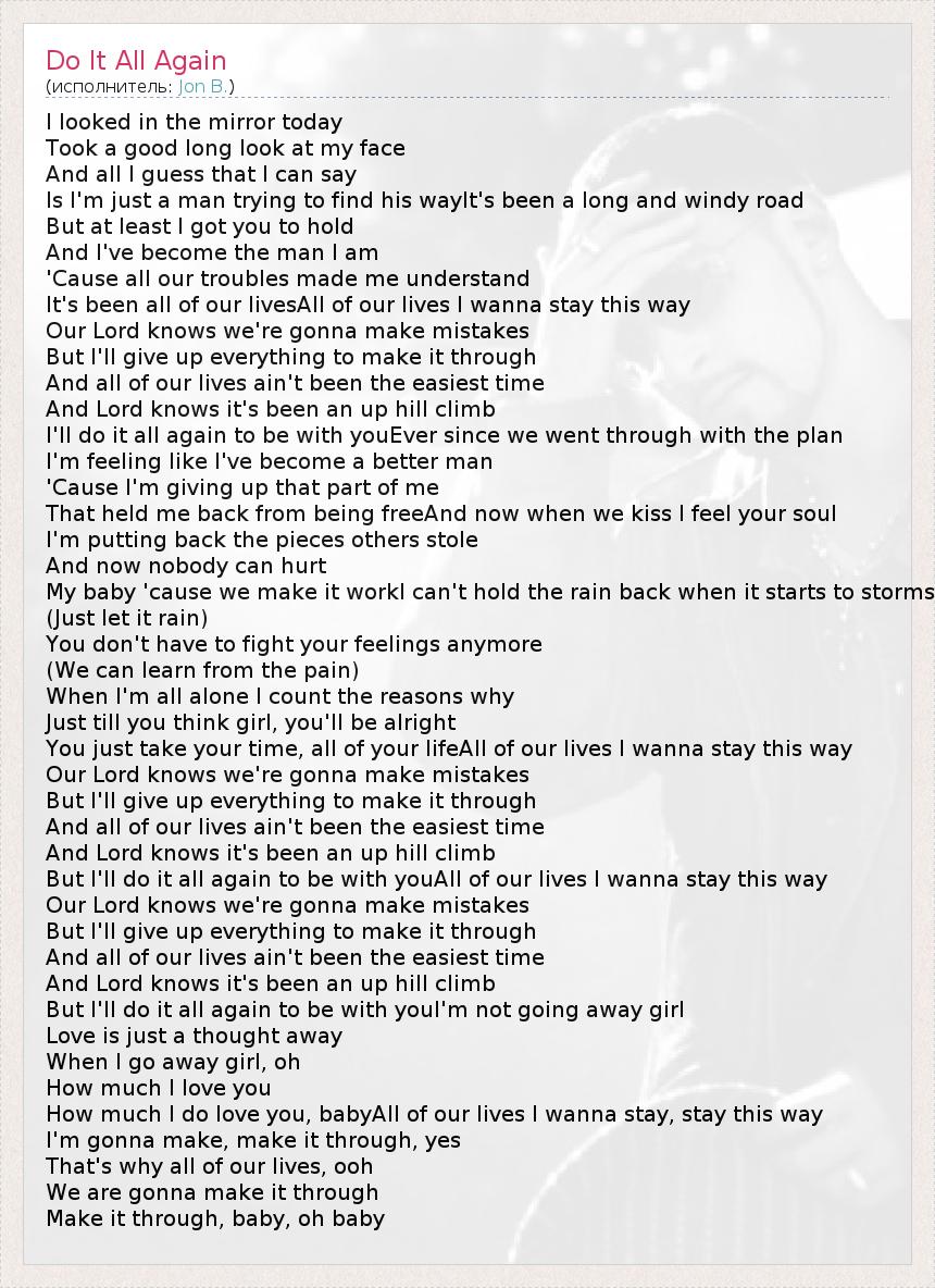 I looked in the mirror today Took a good long look at my face And all I guess that I can say Is I'm just a man trying to find his wayIt's been a long and windy road But at least I got you to hold And I've become the man I am 'Cause all our troubles made me understand It's been all of our livesAll of our lives I wanna stay this way Our Lord knows we're gonna make mistakes But I'll give up everything to make it through And all of our lives ain't been the easiest time And Lord knows it's been an up hill climb I'll do it all again to be with youEver since we went through with the plan I'm feeling like I've become a better man 'Cause I'm giving up that part of me That held me back from being freeAnd now when we kiss I feel your soul I'm putting back the pieces others stole And now nobody can hurt My baby 'cause we make it workI can't hold the rain back when it starts to storms (Just let it rain) You don't have to fight your feelings anymore (We can learn from the pain) When I'm all alone I count the reasons why Just till you think girl, you'll be alright You just take your time, all of your lifeAll of our lives I wanna stay this way Our Lord knows we're gonna make mistakes But I'll give up everything to make it through And all of our lives ain't been the easiest time And Lord knows it's been an up hill climb But I'll do it all again to be with youAll of our lives I wanna stay this way Our Lord knows we're gonna make mistakes But I'll give up everything to make it through And all of our lives ain't been the easiest time And Lord knows it's been an up hill climb But I'll do it all again to be with youI'm not going away girl Love is just a thought away When I go away girl, oh How much I love you How much I do love you, babyAll of our lives I wanna stay, stay this way I'm gonna make, make it through, yes That's why all of our lives, ooh We are gonna make it through Make it through, baby, oh baby