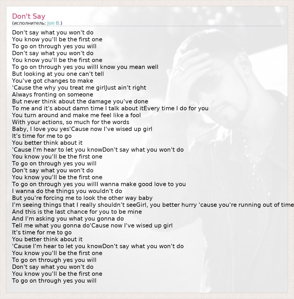 Don't say what you won't do You know you'll be the first one To go on through yes you will Don't say what you won't do You know you'll be the first one To go on through yes you willI know you mean well But looking at you one can't tell You've got changes to make 'Cause the why you treat me girlJust ain't right Always fronting on someone But never think about the damage you've done To me and it's about damn time I talk about itEvery time I do for you You turn around and make me feel like a fool With your actions, so much for the words Baby, I love you yes'Cause now I've wised up girl It's time for me to go You better think about it 'Cause I'm hear to let you knowDon't say what you won't do You know you'll be the first one To go on through yes you will Don't say what you won't do You know you'll be the first one To go on through yes you willI wanna make good love to you I wanna do the things you wouldn't do But you're forcing me to look the other way baby I'm seeing things that I really shouldn't seeGirl, you better hurry 'cause you're running out of time And this is the last chance for you to be mine And I'm asking you what you gonna do Tell me what you gonna do'Cause now I've wised up girl It's time for me to go You better think about it 'Cause I'm hear to let you knowDon't say what you won't do You know you'll be the first one To go on through yes you will Don't say what you won't do You know you'll be the first one To go on through yes you will