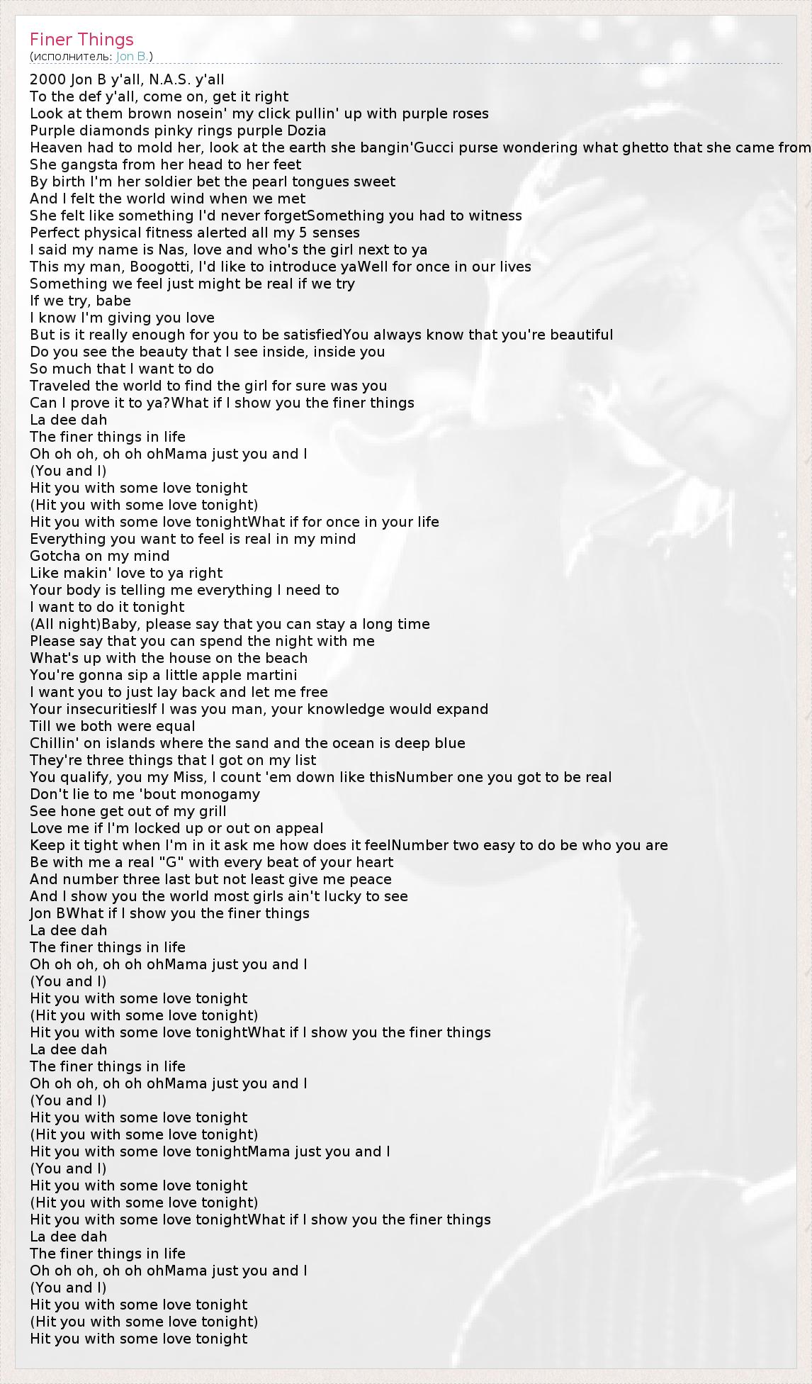 2000 Jon B y'all, N.A.S. y'all To the def y'all, come on, get it right Look at them brown nosein' my click pullin' up with purple roses Purple diamonds pinky rings purple Dozia Heaven had to mold her, look at the earth she bangin'Gucci purse wondering what ghetto that she came from She gangsta from her head to her feet By birth I'm her soldier bet the pearl tongues sweet And I felt the world wind when we met She felt like something I'd never forgetSomething you had to witness Perfect physical fitness alerted all my 5 senses I said my name is Nas, love and who's the girl next to ya This my man, Boogotti, I'd like to introduce yaWell for once in our lives Something we feel just might be real if we try If we try, babe I know I'm giving you love But is it really enough for you to be satisfiedYou always know that you're beautiful Do you see the beauty that I see inside, inside you So much that I want to do Traveled the world to find the girl for sure was you Can I prove it to ya?What if I show you the finer things La dee dah The finer things in life Oh oh oh, oh oh ohMama just you and I (You and I) Hit you with some love tonight (Hit you with some love tonight) Hit you with some love tonightWhat if for once in your life Everything you want to feel is real in my mind Gotcha on my mind Like makin' love to ya right Your body is telling me everything I need to I want to do it tonight (All night)Baby, please say that you can stay a long time Please say that you can spend the night with me What's up with the house on the beach You're gonna sip a little apple martini I want you to just lay back and let me free Your insecuritiesIf I was you man, your knowledge would expand Till we both were equal Chillin' on islands where the sand and the ocean is deep blue They're three things that I got on my list You qualify, you my Miss, I count 'em down like thisNumber one you got to be real Don't lie to me 'bout monogamy See hone get out of my grill Love me if I'm locked up or out on appeal Keep it tight when I'm in it ask me how does it feelNumber two easy to do be who you are Be with me a real "G" with every beat of your heart And number three last but not least give me peace And I show you the world most girls ain't lucky to see Jon BWhat if I show you the finer things La dee dah The finer things in life Oh oh oh, oh oh ohMama just you and I (You and I) Hit you with some love tonight (Hit you with some love tonight) Hit you with some love tonightWhat if I show you the finer things La dee dah The finer things in life Oh oh oh, oh oh ohMama just you and I (You and I) Hit you with some love tonight (Hit you with some love tonight) Hit you with some love tonightMama just you and I (You and I) Hit you with some love tonight (Hit you with some love tonight) Hit you with some love tonightWhat if I show you the finer things La dee dah The finer things in life Oh oh oh, oh oh ohMama just you and I (You and I) Hit you with some love tonight (Hit you with some love tonight) Hit you with some love tonight