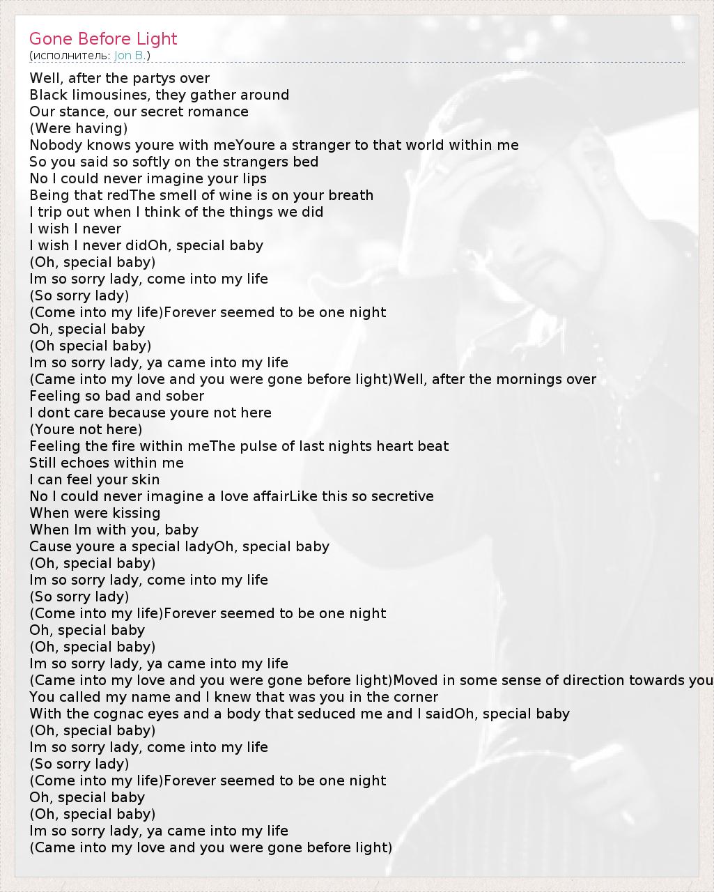 Well, after the partys over Black limousines, they gather around Our stance, our secret romance (Were having) Nobody knows youre with meYoure a stranger to that world within me So you said so softly on the strangers bed No I could never imagine your lips Being that redThe smell of wine is on your breath I trip out when I think of the things we did I wish I never I wish I never didOh, special baby (Oh, special baby) Im so sorry lady, come into my life (So sorry lady) (Come into my life)Forever seemed to be one night Oh, special baby (Oh special baby) Im so sorry lady, ya came into my life (Came into my love and you were gone before light)Well, after the mornings over Feeling so bad and sober I dont care because youre not here (Youre not here) Feeling the fire within meThe pulse of last nights heart beat Still echoes within me I can feel your skin No I could never imagine a love affairLike this so secretive When were kissing When Im with you, baby Cause youre a special ladyOh, special baby (Oh, special baby) Im so sorry lady, come into my life (So sorry lady) (Come into my life)Forever seemed to be one night Oh, special baby (Oh, special baby) Im so sorry lady, ya came into my life (Came into my love and you were gone before light)Moved in some sense of direction towards you You called my name and I knew that was you in the corner With the cognac eyes and a body that seduced me and I saidOh, special baby (Oh, special baby) Im so sorry lady, come into my life (So sorry lady) (Come into my life)Forever seemed to be one night Oh, special baby (Oh, special baby) Im so sorry lady, ya came into my life (Came into my love and you were gone before light)